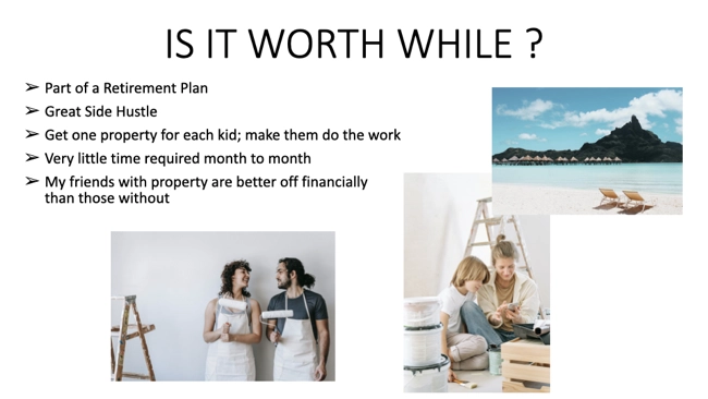 In general, if the business is set up correctly, it runs itself as a nice side hustle, making it so you don't have to give up your day job. As a long term plan, it makes a great retirement planning vehicle. It's also a great way to pass on generational wealth: purchase investment property for each child and when they are old enough, make them do the work.